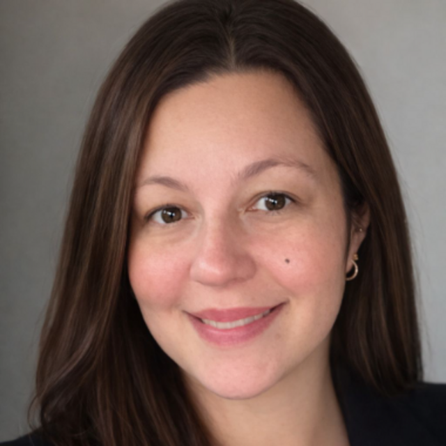 Eine junge Frau mit glattem braunem Haar und grauem Pullover steht mit einem strahlenden Lächeln vor einem schlichten hellen Hintergrund und ist bereit, erstklassige Reinigungsdienste anzubieten.