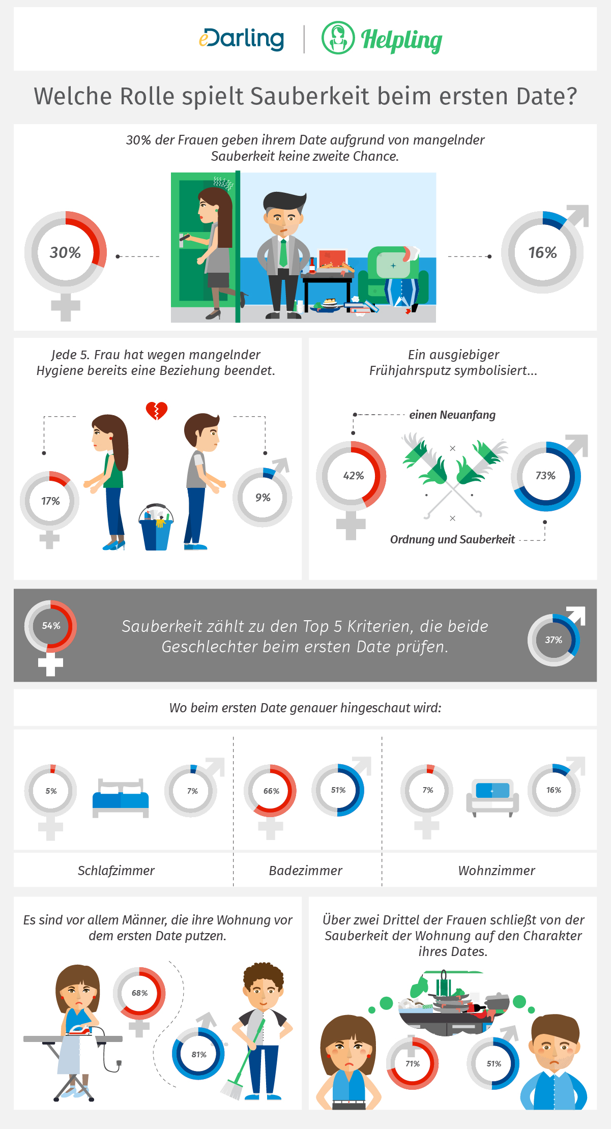 Ob Bartstoppeln im Waschbecken, benutztes Geschirr in der Küche oder getragene Wäsche auf dem Schlafzimmer-Fußboden: Unordnung ist einer der häufigsten Streitgründe in einer Beziehung. Allzu häufig bleibt es aber nicht nur bei einem Streit: Jede fünfte Frau beendet die Beziehung wegen der vorherrschenden Unordnung! Nicht verwunderlich, dass die meisten Frauen ihrem potenziellen Partner bereits beim ersten Date auf den Sauberkeits-Zahn fühlen. Zusammen mit der Partnervermittlung eDarling haben wir 752 Singles in Deutschland befragt, wie wichtig ihnen Hygiene und Ordnung beim ersten Date bzw. in einer gepflegten Beziehung sind: