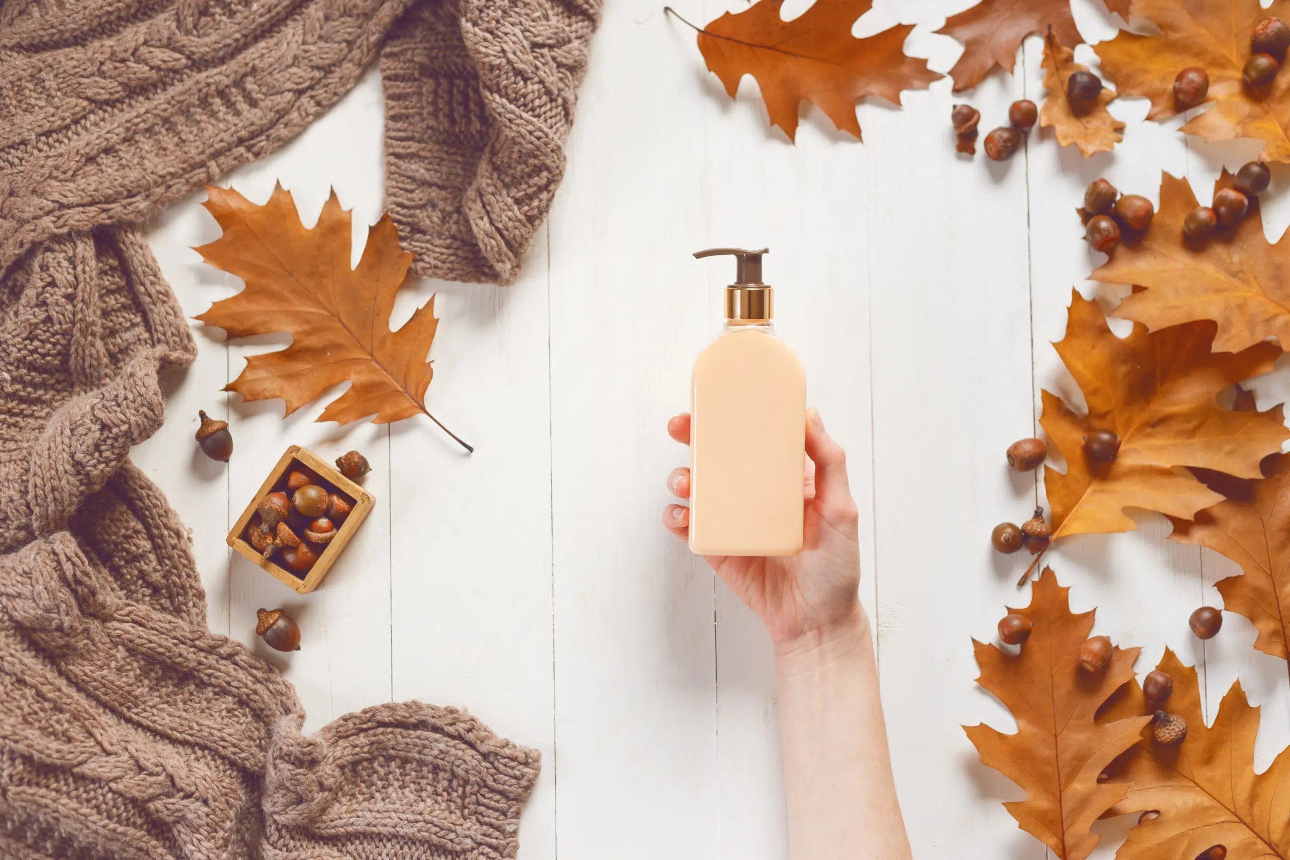 Flüssigseife-Flasche in einem herbstlichen Thema Hintergrund