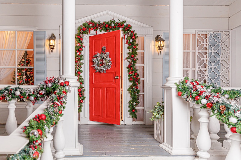Eine rote Tür auf einer weißen Veranda, geschmückt mit einem Kranz und Girlanden.