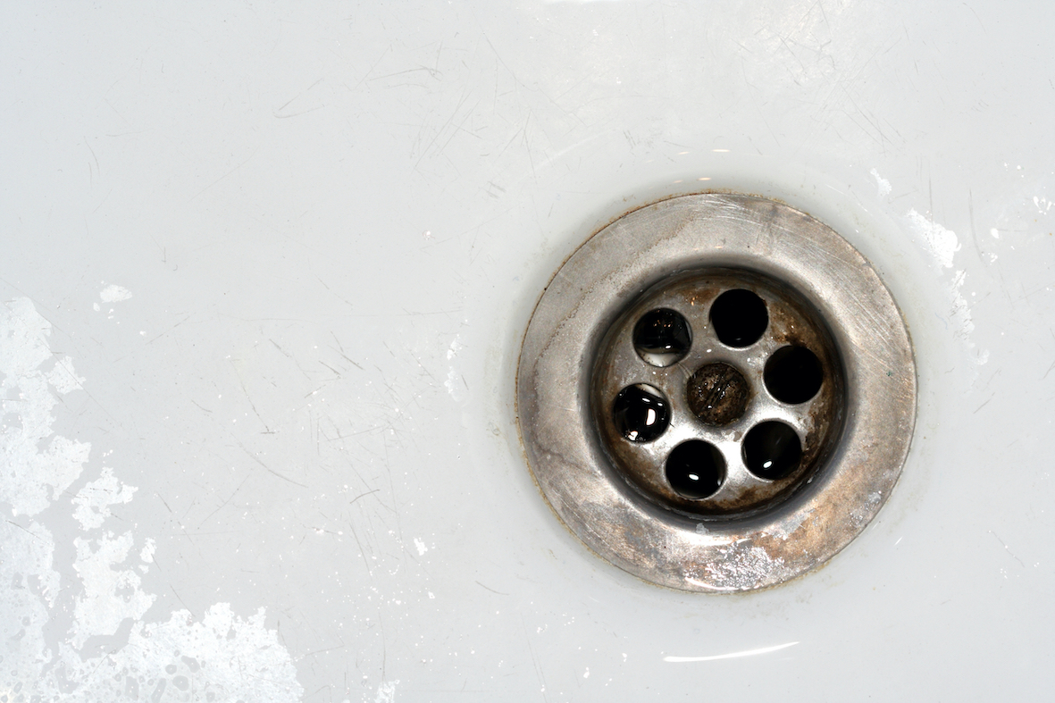 Nahaufnahme eines schmutzigen Abflusses im Waschbecken, ideal zum Putzen.