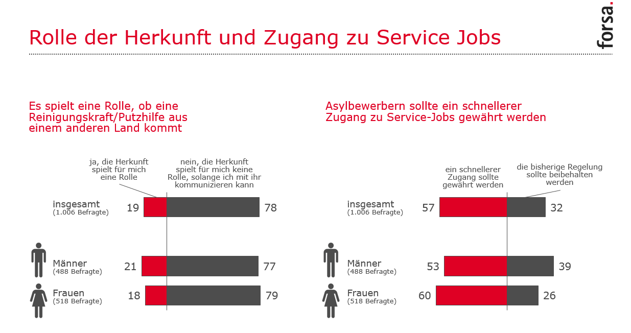 Im Rahmen der Flüchtlingsdebatte ist auch eine Diskussion darum entfacht, ob einfache Dienstleistungsberufe Asylbewerbern schneller geöffnet werden sollen. Zuletzt hat sich Prof. Werner Sinn vom Institut für Wirtschaftsforschung dafür eingesetzt. Doch was halten die Deutschen davon? Immerhin sind 57% der Deutschen der Meinung, dass Asylbewerber schneller Zugang zu Service-Jobs wie Putzen erhalten sollten. Lediglich jeder dritte Befragte ist der Meinung, dass die bisherigen Regelungen beibehalten werden sollen.