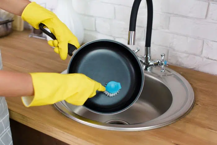- Pfanne gründlich reinigen: Rückstände und Ölreste mit heißem Wasser und einer Bürste entfernen. Danach gut trocknen.