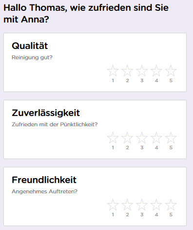In folgenden drei Kategorien können Sie Ihre Reinigungskraft beurteilen: Die Qualität der Reinigung, die Zuverlässigkeit und die Freundlichkeit. Das Tolle: Vorher haben Sie Ihre Meinung per E-Mail kundgetan, ab jetzt geht dies bequem aus Ihrem Benutzerkonto heraus!