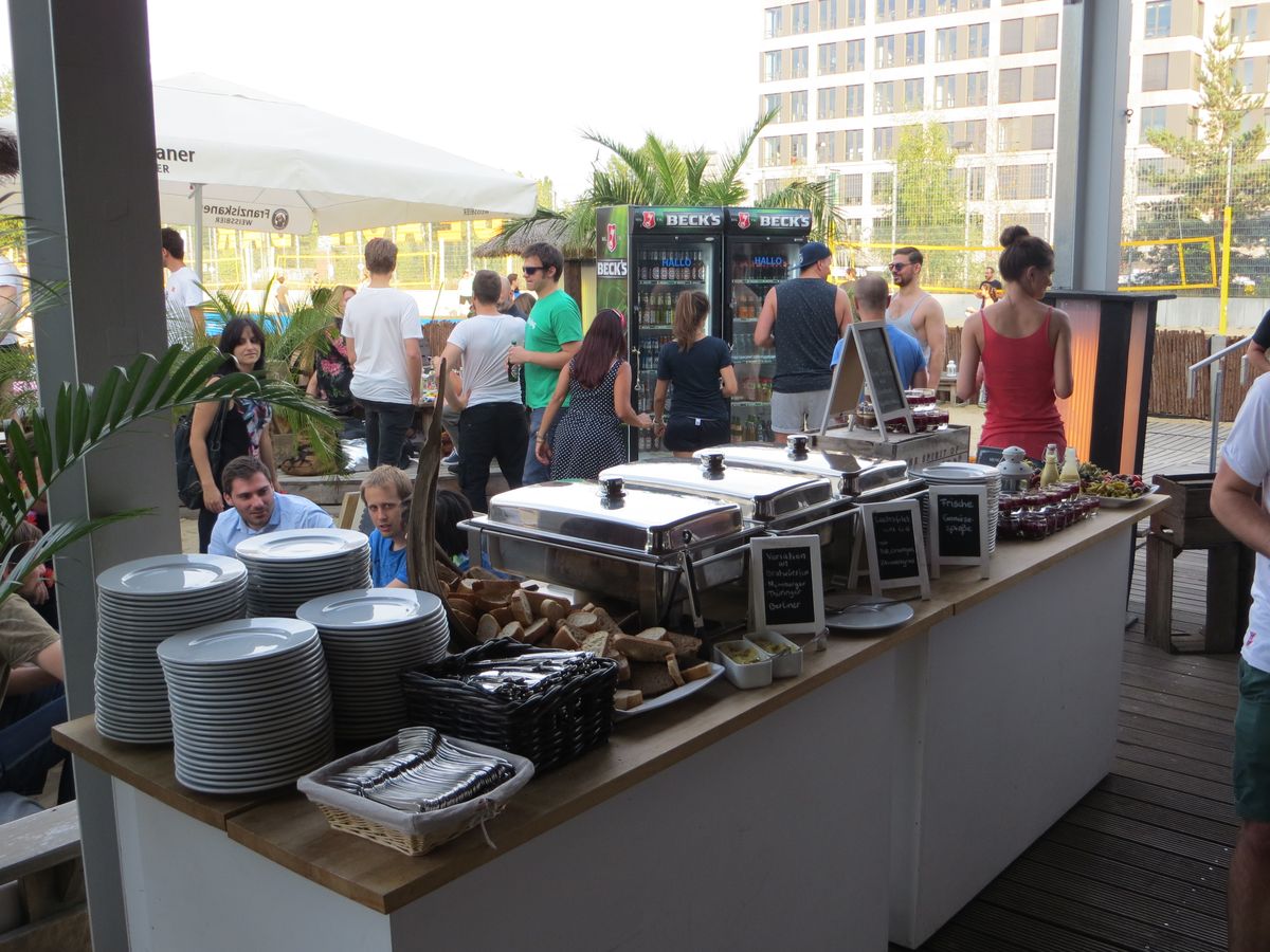 Wer einfach nur entspannen wollte, relaxte mit den Kollegen bei einem kalten Bier oder vergnügte sich beim Kickern oder Tischtennis. Man hatte viel Zeit, auch mit den Kollegen Zeit zu verbringen, die man im Arbeitsalltag seltener sieht. Etwas später am Abend wurde dann das Buffet für die 300 Mitarbeiter aus über 25 Nationen eröffnet, die sich mit umfangreichen Grill-Köstlichkeiten, Salaten jeglicher Art und den verlockendsten Desserts für einen langen Abend stärkten. Nach Sonnenuntergang machten es sich viele von uns an den offenen Feuerstelle bequem – Marshmallows durften da natürlich nicht fehlen.