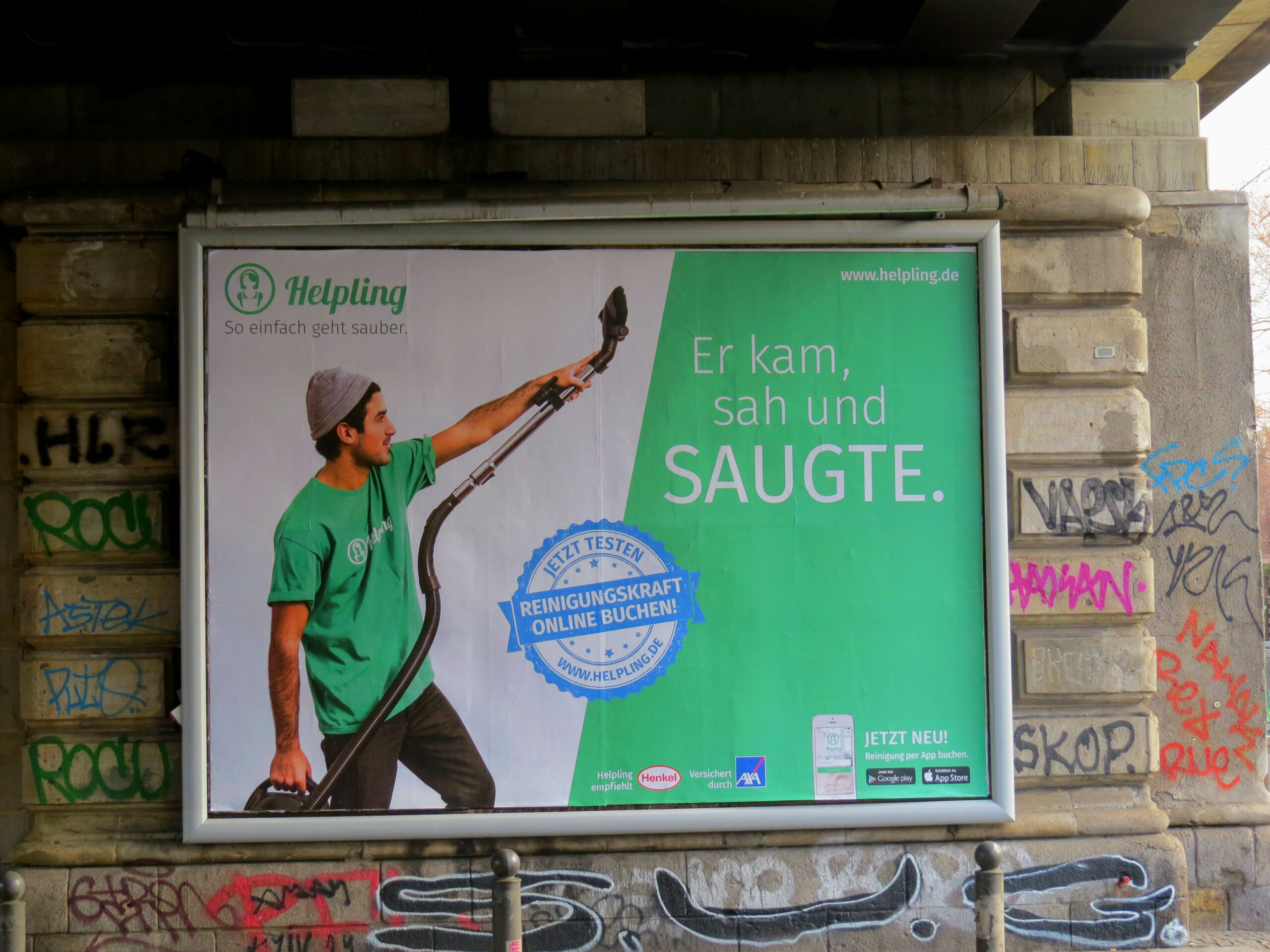 “Der Klügere wischt nach”, “Er kam, sah und saugte” und “Schwamm-Intelligenz” – so lauten seit Anfang dieser Woche die drei Slogans der aktuellen Plakat-Kampagne von Helpling. Wir möchten damit gegen das Klischee vorgehen, dass Saubermachen ein Schmuddeljob ist. Die Reinigungskräfte zeigen sich mit Staubsaugern als tragbare Wunderwaffe oder sagen dem Schmutz mit einem Wischmopp charmant den Kampf an. Fußgängern, Autofahrern und U- oder S-Bahnfahrern geben sie ihre Botschaft mit auf den Weg: “Reinigen ist ein Handwerk und Putzutensilien sind unsere Werkzeuge”. Der Markt für private Wohnungsreinigungen besteht weiterhin zu 90% aus Schwarzarbeit. Wir haben es uns zum Ziel gemacht, diesen Markt aus dem Schattendasein zu holen und zu professionalisieren.
