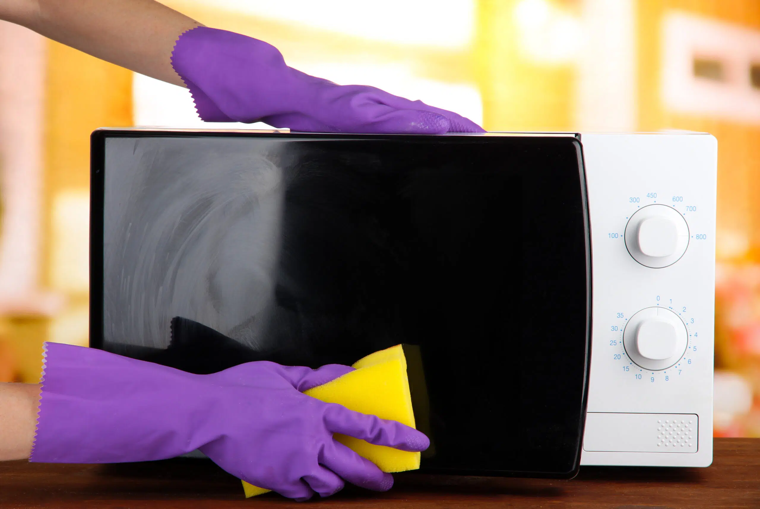 Lila Handschuhe reinigen Mikrowelle mit gelbem Schwamm, Fokus auf Reinigungskraft.