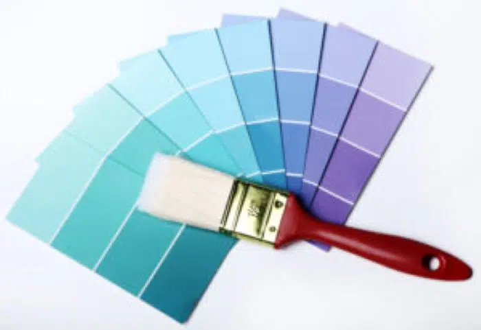 Pinsel auf Fächer aus Farbmusterkarten in Blau- und Lilatönen, ideal für Reinigung.