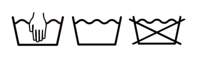Mit allen Wassern gewaschen: Das Waschen wird durch eine Waschwanne dargestellt. Die Zahl darin steht für die Höchsttemperatur in Grad Celsius, eine Hand weist auf Handwäsche hin und das durchgestrichene Symbol bedeutet, dass eine Wäsche unter haushaltsüblichen Bedingungen nicht vorgesehen ist. Ein Strich unter dem Symbol erfordert ein Pflegeleicht- oder Schonwaschprogramm. Bei zwei Strichen empfiehlt sich der Schonwaschgang (sowie gering bis gar nicht schleudern).