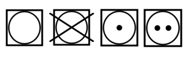 Trocknen: Der maschinelle Trockner wird durch einen Kreis in einem Quadrat dargestellt. Ein Punkt darin steht für das Trocknen mit verringerter Temperatur, zwei Punkte erlauben die normale Temperatur. Ist das Trocknersymbol durchgestrichen, verträgt der Artikel keine maschinelle Trocknung.