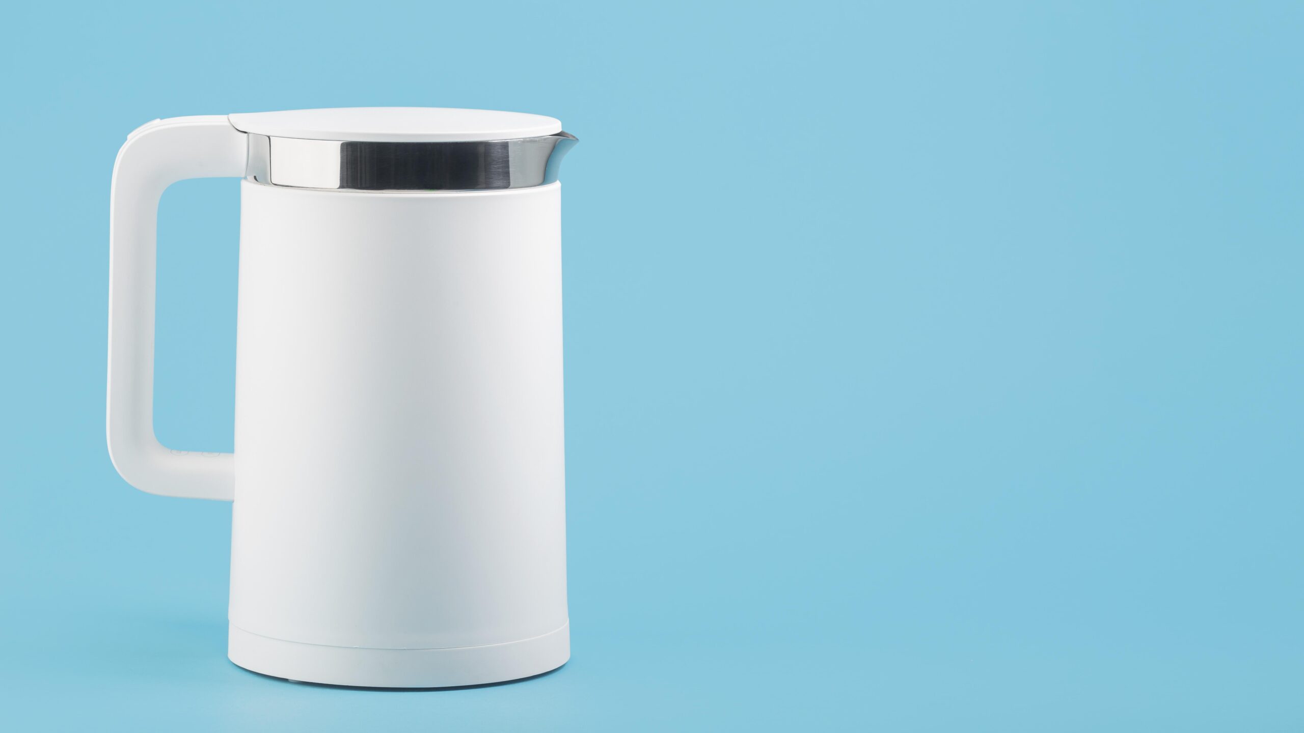 Weißer Wasserkocher vor blauem Hintergrund, sauber und bereit zum Einsatz. Reinigung wichtig.