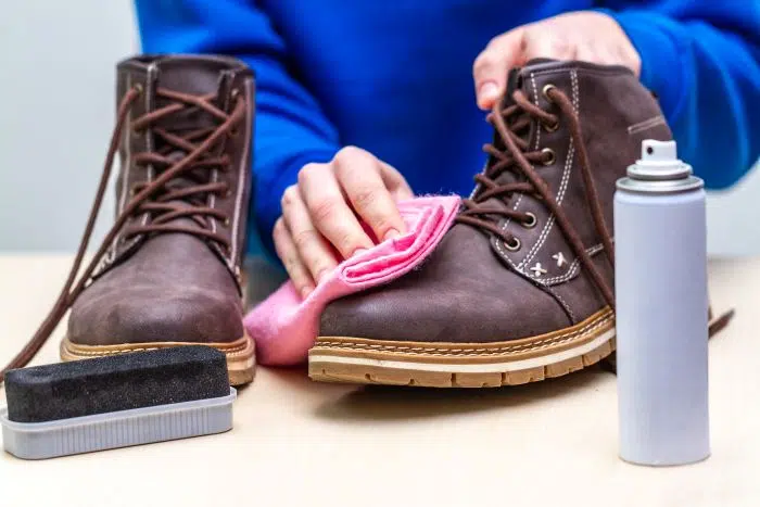 Person Is Cleaning Men S Suede Casual Boots With Brush Rag Spray Shoe Shine Footwear Moisture Dirt Protection 1