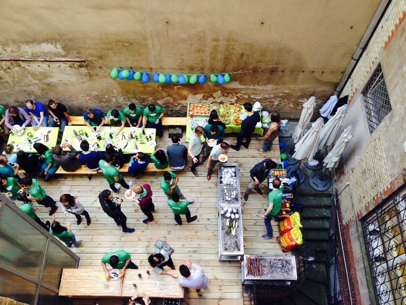Ein kleiner Einblick in unsere Bürostruktur: Das Gebäude bietet Platz für 300 Mitarbeiter, aufgeteilt auf vier Etagen. Auf jeder befindet sich ein designter Themenraum: Ob Kaminzimmer, Strandkorb oder Kuckucksuhren – hier findet man Ruhe und Raum für kreative Ideen. Jede Etage hat zudem große Küchen und helle Lounge-Räume, in denen sich die Mitarbeiter zum gemeinsamen Mittagessen treffen. Im Eingangsbereich im Erdgeschoss hängen Team-Fotos der verschiedenen Länder, die Pressewand zeigt Medienartikel, in denen über Helpling berichtet wurde. Jeder Mitarbeiter ist auf einem Polaroid-Foto namentlich abgebildet. Einer der beliebtesten Treffpunkte des neuen Büros ist der Innenhof: Ob die Sommerparty, zahlreiche Feierabend-Biere oder große Meetings mit allen Mitarbeitern – bislang wurde der Hof für die unterschiedlichsten Anlässe umfangreich genutzt. Wie wir ihn für den Winter umgestalten, ist noch offen.